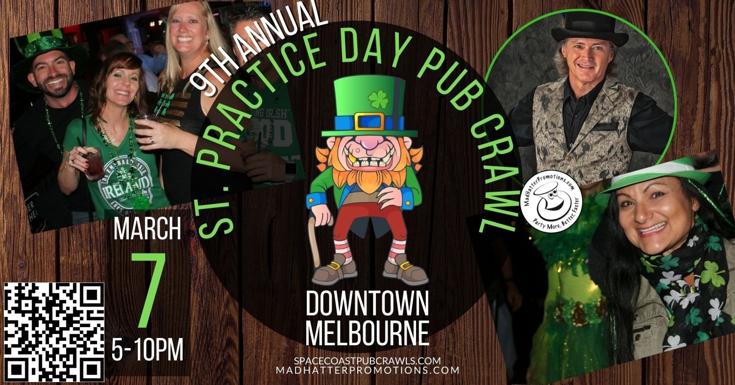 9th Annual St. Practice Day Pub Crawl in Downtown Melbourne, Saturday, 7 March, 5 pm to 10 pm. Beating the Leprechauns at their own game! Get your Blarney on! Five (5) drinks $18 in advance or $25 day of. 50/50 Drawing for The Children’s Hunger Project AND multiple door prizes! Starts at Iron Oak Post, 2023 Melbourne Court, Melbourne, FL 32901 https://www.madhatterpromotions.com/2026-st-practice-pub-crawl.php